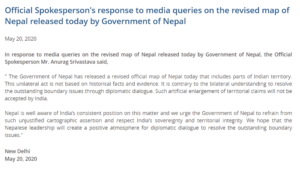 बुधबार भारतीय विदेश मन्त्रालयले विज्ञप्ति जारी गर्दै नेपालले जारी गरेको नक्साबारे मुख खोलेको हो। ‘एकपक्षीय कदम ऐतिहासिक तथ्य र प्रमाणमा आधारित छैन्। यो सीमा समस्यालाई द्वीपक्षीय कूटनीतिक सम्वादमार्फत समाधान गर्ने समझदारी विपरित छु विदेश मन्त्रालयद्वारा जारी विज्ञप्तिमा भनिएको छ।
