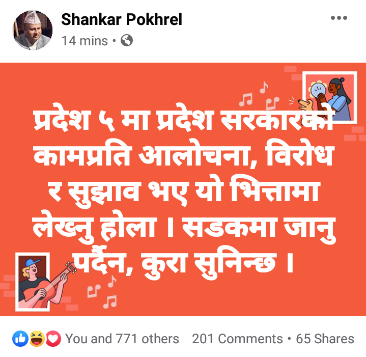 शुक्रबार उनले फेसबुक स्टाटसममर्फत “प्रदेश ५ मा प्रदेश सरकारको कामप्रति आलोचना, विरोध र सुझाव भए यो भित्तामा लेख्नु होला । सडकमा जानु पर्दैन, कुरा सुनिन्छ ।” भन्दै पोस्ट गरेका छन् ।