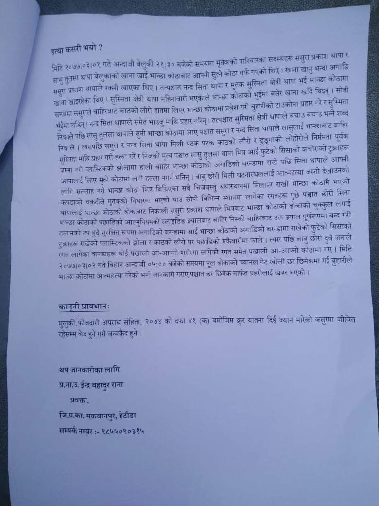 हेटौंडा ।कपिलवस्तुकी युवती सुस्मिताको हेटौंडामा भएको हत्याकाण्डका दोषी जिल्ला प्रहरी कार्यालय मकवानपुर हेटौंडाद्वारा सार्वजनिक गरिएको छ ।