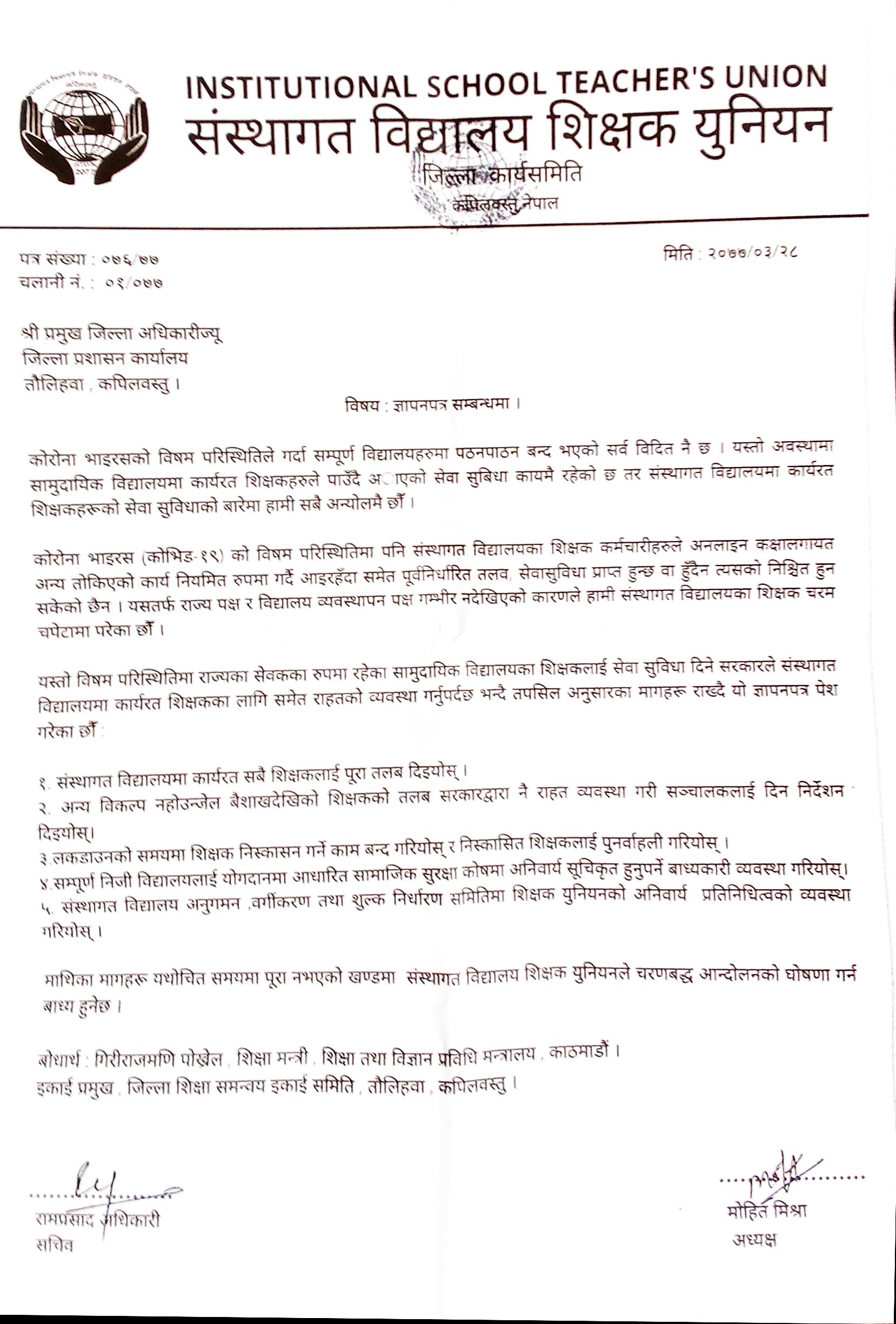 ३.लकडाउनको समयमा शिक्षक निस्कासन गर्ने काम बन्द गरियोस् र निस्कासित शिक्षकलाई पुनर्वाहली गरियोस् ।