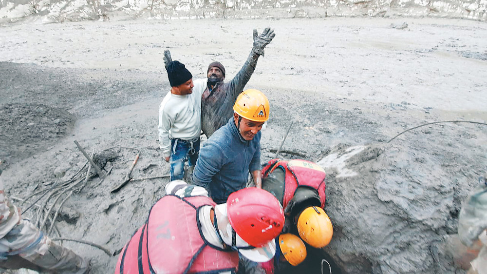 भारतको उत्तराखण्ड चमोलीको तपोवन क्षेत्रमा आइतबार हिमनदी फुटेरआएको बाढीमा पुरिएकालाई उद्धार गरिएपछि खुसी हुँदै (पन्जा लगाएका) । तस्बिर : एपी