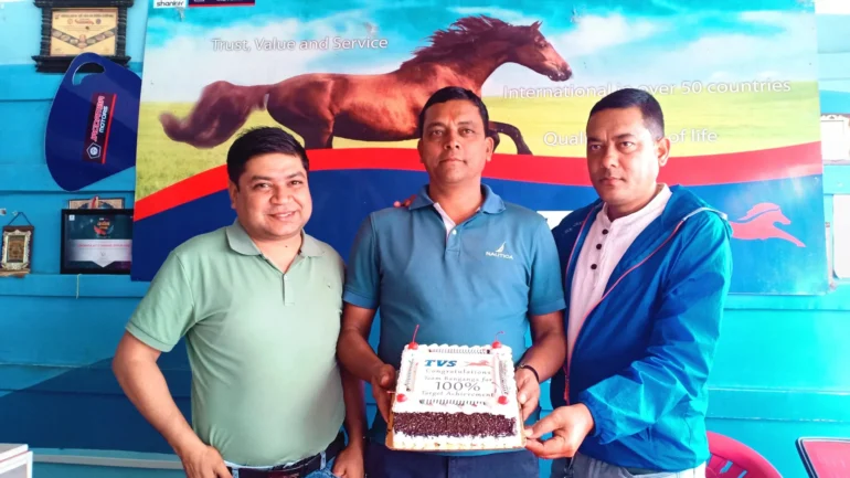 यसवर्ष टिभिएस ब्राण्डका मोटरसाईकल र स्कुटर विक्री गरेर लक्ष्य हासिल गरेकोमा कम्पनीले केक काटेर खुशीयाली मनाएको हो । पछिल्लो समय बजारमा मन्दी आइरहेका बेला टिभिएस कम्पनीले भने आफनो लक्ष्य अनुसार विक्री वितरण गरेर व्यवसायिक सफलता हात पारेको हो । उक्त सफलता हात पार्न ग्राहकको रोजाईमा परेको टिभिएस व्राण्डको आधिकारीक विक्रेता वाणगंगा अटो ट्रेडर्सका संचालकलाई कम्पनीले विशेष धन्यवाद प्रकट गरेको छ ।