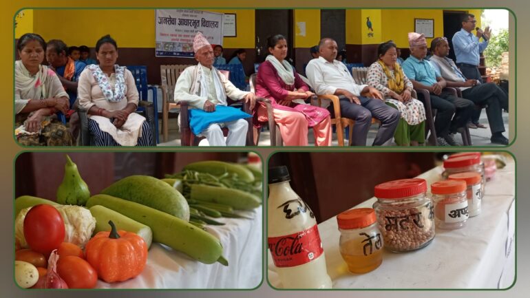 सन्तुलित भोजन गरौँ, स्वास्थ रहौँ, हरेक बार खाना चार भन्ने नाराका साथ विद्यालय प्राङ्गणमा आयोजना गरिएको उक्त कार्यक्रममा शिक्षक तथा विद्यार्थीहरुले शरीरलाई शक्ति दिने, शरिरको रक्षा गर्ने र शिरीर बृद्धि गर्ने खानाका छुट्टाछुट्टै स्टल बनाएर प्रदर्शन गरेका थिए भने एउटा स्टल स्थानीय स्तरमा पाइने जडिबुटीजन्य वनस्पतीको समेत प्रर्दशनीमा राखिएको थियो ।