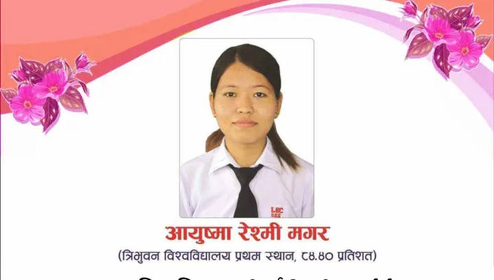 कपिलवस्तुको बाणगंगाकी आयुश्मा रेश्मी ‘मगर’ त्रिभुवन विश्वविद्यालय प्रथम हुन सफल भएकी छिन् ।