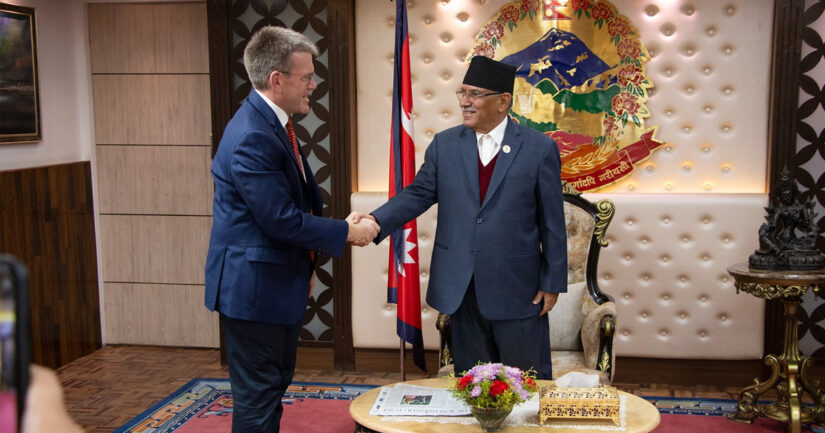 नेपालका लागि अमेरिकी राजदूत डीन थम्पसनले प्रधानमन्त्री पुष्पकमल दाहाल ‘प्रचण्ड’लाई भेटेका छन्। राजदूत थम्पसनले बिहीबार बिहान प्रधानमन्त्री निवास बालुवाटारमा पुगेर नेकपा माओवादी केन्द्रका अध्यक्षसमेत रहेका प्रधानमन्त्री प्रचण्डलाई भेटेका हुन्।