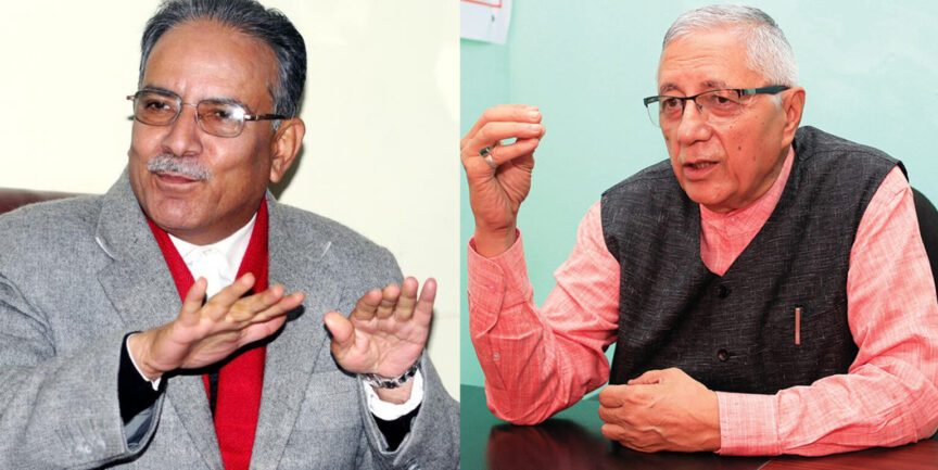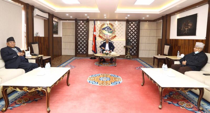 नेकपा एमालेका अध्यक्ष केपी ओलीले पुष्पकमल दाहाल ‘प्रचण्ड’ र माधवकुमार